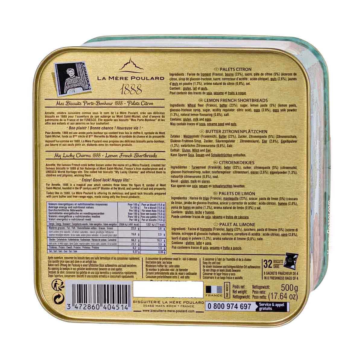 Wheat flour (France), butter (23%), sugar, lemon paste (5%) (lemon peels, glucose-fructose syrup, sugar, acidity regulator citric acid), eggs (2.8%), egg yolk powder (1.3%), natural lemon flavoring (0.8%), salt. Contains gluten, milk and eggs. May contain traces of soya, sesame seed and nuts.