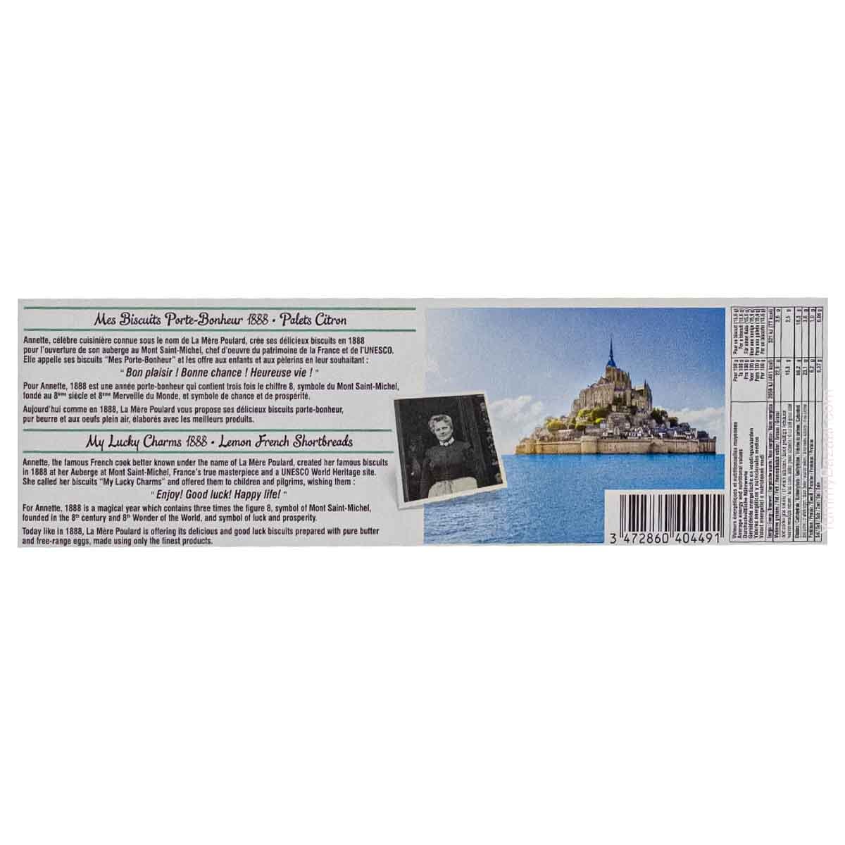 Wheat flour (France), butter (23%), sugar, lemon paste (5%) (lemon peel, glucose-fructose syrup, sugar, acidity regulator citric acid), eggs (2, 6%), powdered egg yolks (1.3%), natural lemon flavor (0.8%), salt. Contains gluten, milk and eggs. May contain traces of soy, sesame and nuts.