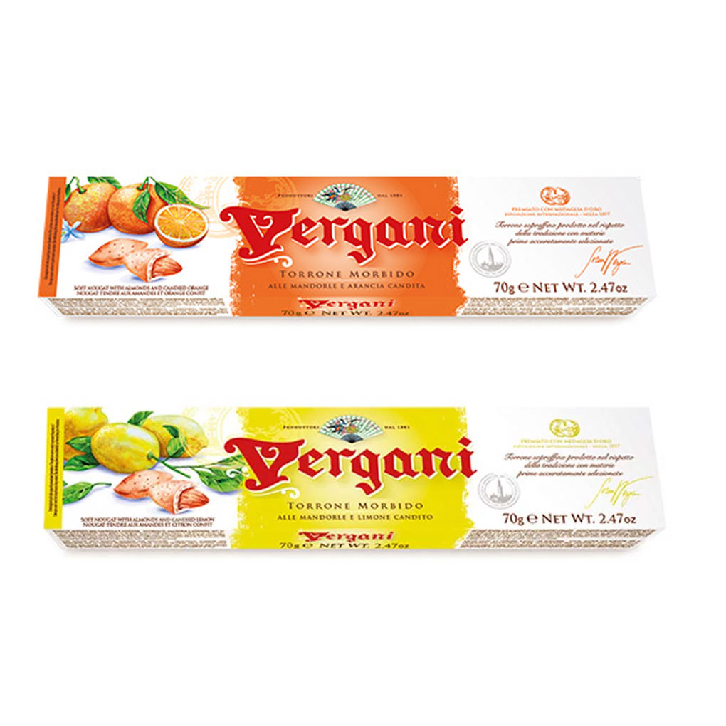 Candied Lemon Nougat: sugar, almonds 25%, glucose fructose syrup, potato starch, candied lemon peel 7% (lemon peel, glucose syrup, sugar, acid: citric acid, preservative: sulphur dioxide), glucose syrup, honey, dextrose, egg white, wafers (potato starch, water), lemon natural flavouring. May contain traces of other nuts and milk. Candied Orange Nougat: sugar, almonds 25%, glucose-fructose syrup, potato starch, candied orange 5% (orange peel pieces, glucose-fructose syrup, sugar, acid: citric acid, preservative: sulphur dioxide), glucose syrup, honey, dextrose, egg white, wafers (potato starch, water), orange natural flavouring. May contain traces of other nuts and milk. Best before: see side.